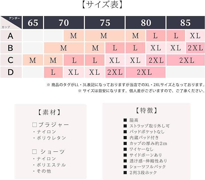 「素材」ブラジャー:ナイロン/ポリウレタン ショーツ:ポリエステル/ナイロン/その他