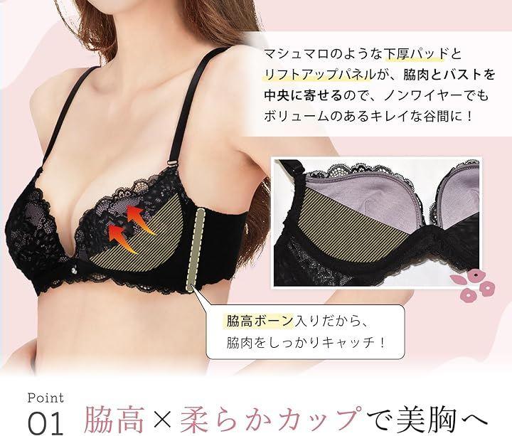 「特徴」 脇高/ストラップ取り外し可/パッドポケットなし/内蔵パッド付き/カップの厚み約2cm/ワイヤーなし/サイドボーンあり/透け感・伸縮性あり/ショーツフルバック/2列3段ホック