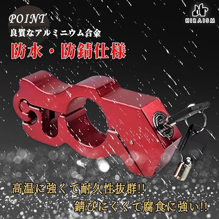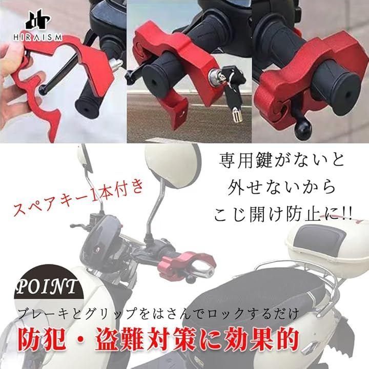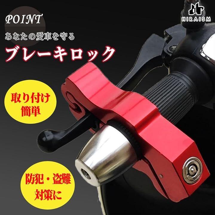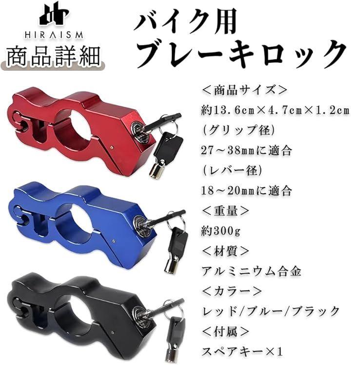 「商品内容」バイク用ブレーキロック <サイズ>約13.6cmx4.7cmx1.2cm (グリップ径)27~38mmに適合 (レバー径)18~20mmに適合 <重量>約300g <材質>アルミニウム合金 <カラー>レッド or ブルー or ブラック <付属>スペアキーx1