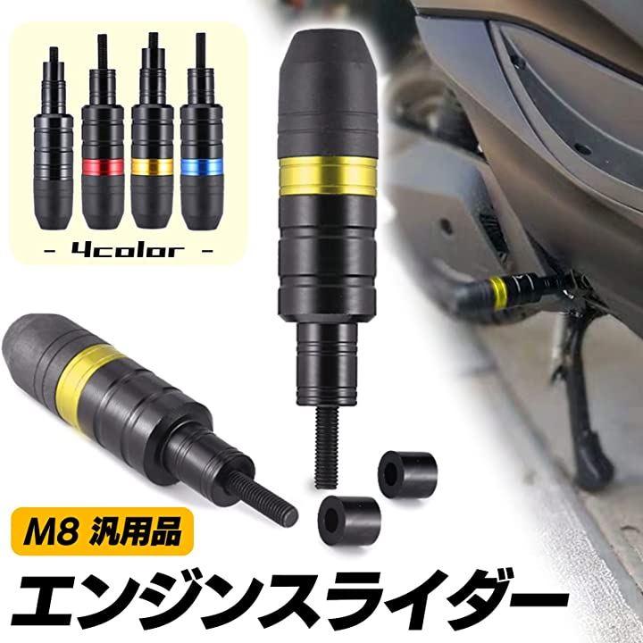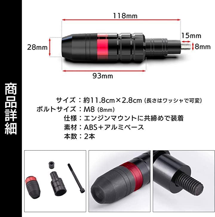 ・「本体サイズ」 約11.8cmx2.8cm (長さはワッシャで可変) 「ボルト」 M8 (8mm) 「仕様」 エンジンマウントに共締めで装着 「素材」 ABS+アルミベース 「付属数」 2本セット 「カラー」 ・ブラックxブラック ・ブラックxレッド ・ブラックxブルー ・ブラックxゴールド