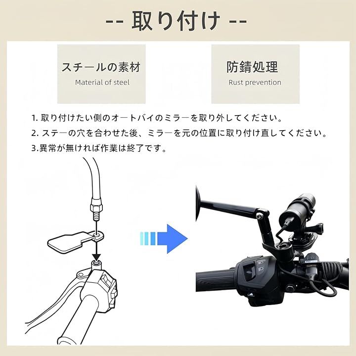 既存のM10ミラー取り付け穴を活用するだけで、簡単に設置完了します。