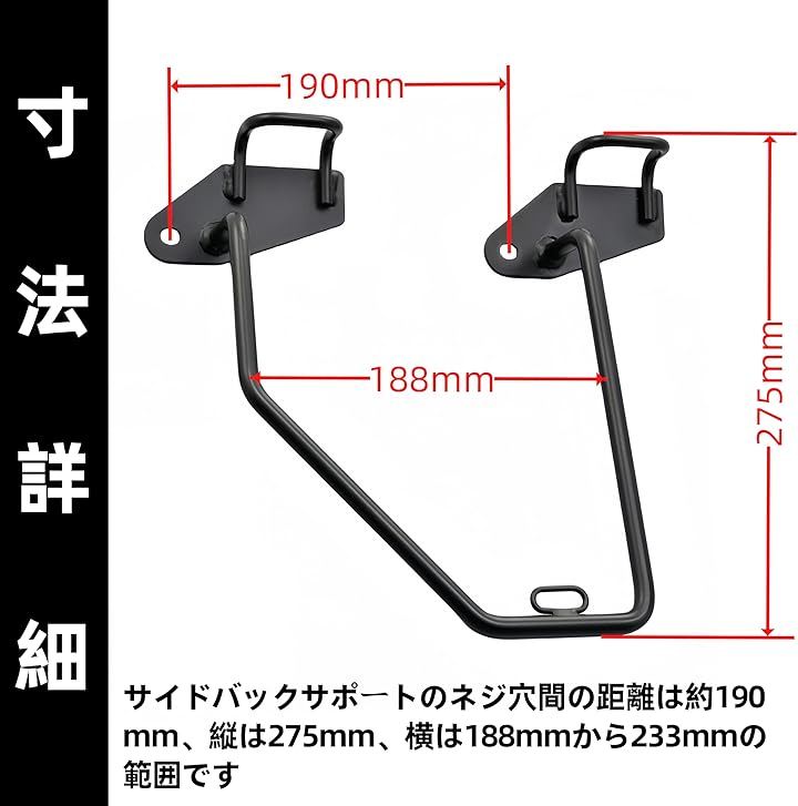 「寸法詳細」サイドバックサポートのネジ穴間の距離は約190mm、縦は275mm、横は188mmから233mmの範囲です。