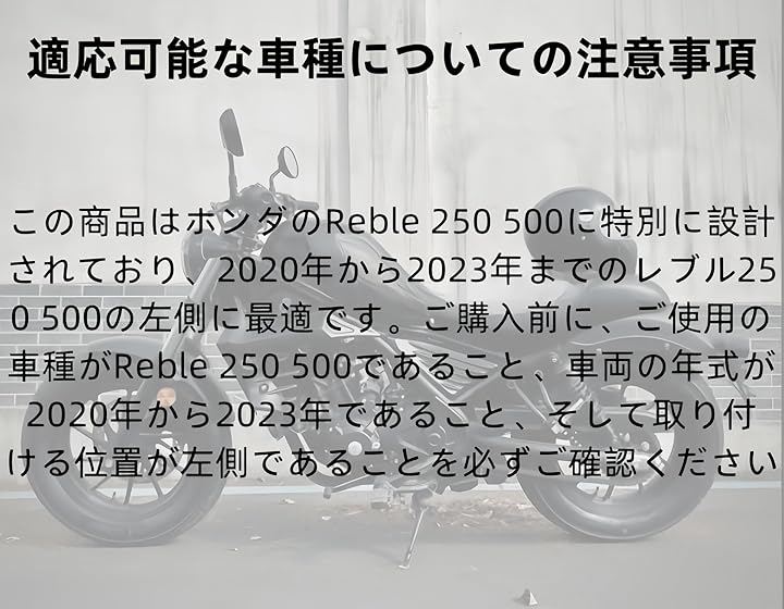 ご購入前に、ご使用の車種がReble 250 500であること、車両の年式が2020年から2023年であること、そして取り付ける位置が左側であることを必ずご確認ください。