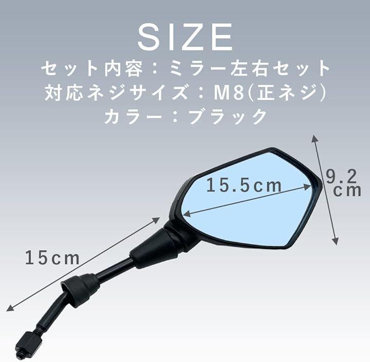 「商品詳細」本体左右セット、ミラーサイズ:横15.5cm,縦8.5cm、ネジサイズ:8mm / 10mm(正ネジ)、カラー:ブラック / カーボン柄