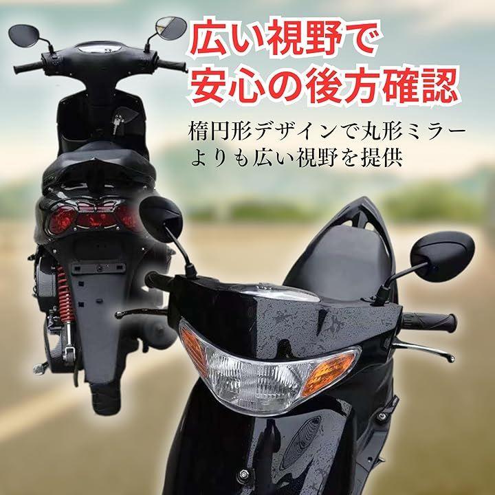 「広い視野で安心の後方確認」 楕円形デザインのバイクミラーは、従来の丸形ミラーよりも広い視野を提供。