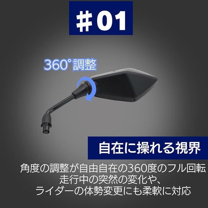 「自在な角度調整」あなたの安全と快適性を考えて設計されたこのミラーは、360度のフル回転機能を持っており、どんな走行スタイルや状況にも合わせて最適な角度に微調整が可能です。