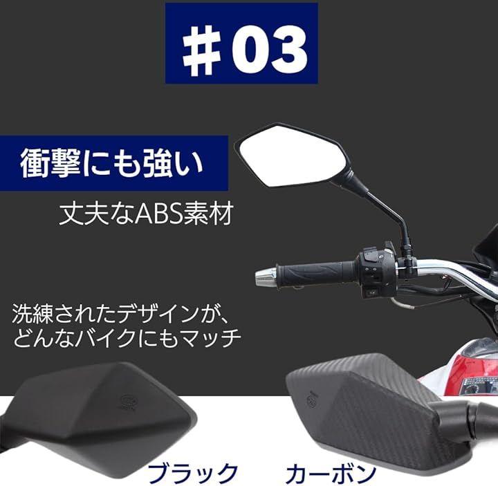 「商品詳細」左右 2点セット 「ミラーサイズ」横15.5cm x 縦8.5cm / 全長約32cm 「ネジサイズ」10mm 「カラー」ブラック/カーボン 「適応車種」ホンダ、ヤマハ、スズキ、カワサキ、グロム等 *ご購入前に車体のサイズに合うかご確認お願いいたします。