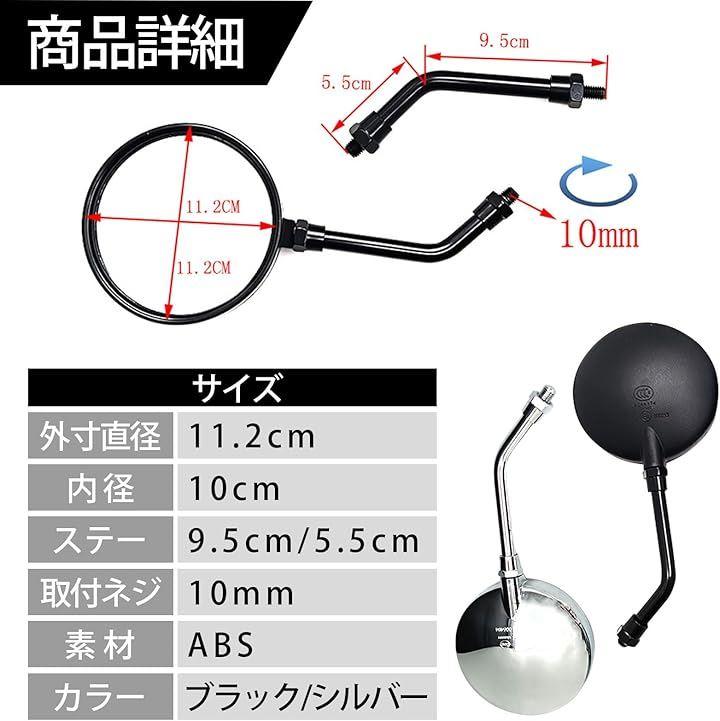 ミラー面径は約112mm、ショートステー全長は約95mmで、見やすさとコンパクトさを兼ね備えています。