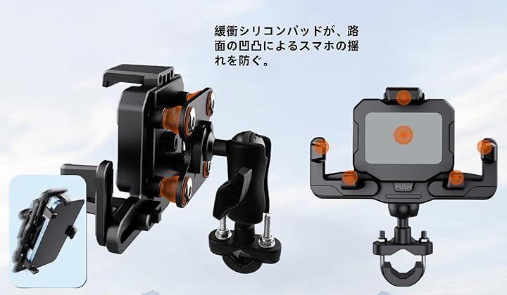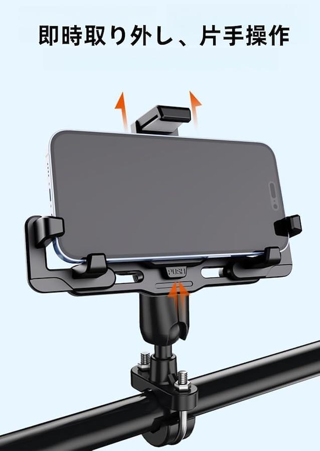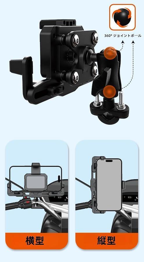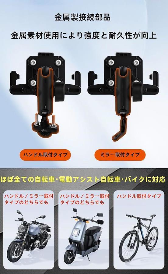 「多機能スマホホルダー」オートバイ・自転車用に設計されたハンドル取付タイプとミラー取付タイプの2種類を選択可能。