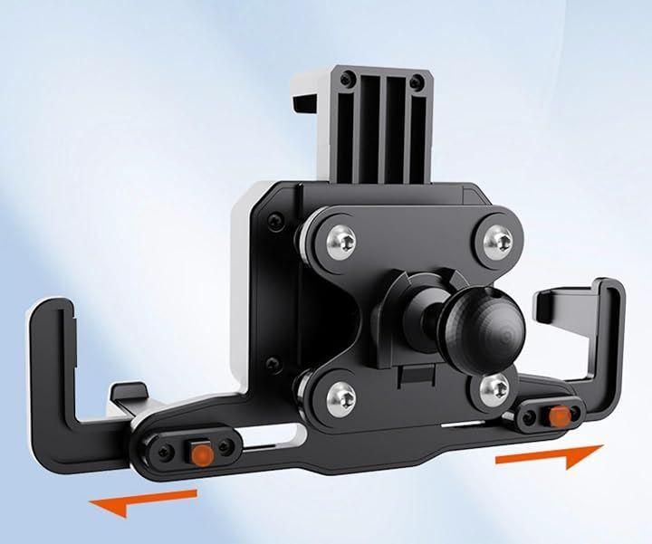 「片手ワンタッチ着脱スマホホルダー」初回のみ背面ボタンで幅調整、以降は置くだけで自動ロック。頑丈アームがスマホを軽く押し込むと瞬時に固定され、手を離せばガッチリホールド。