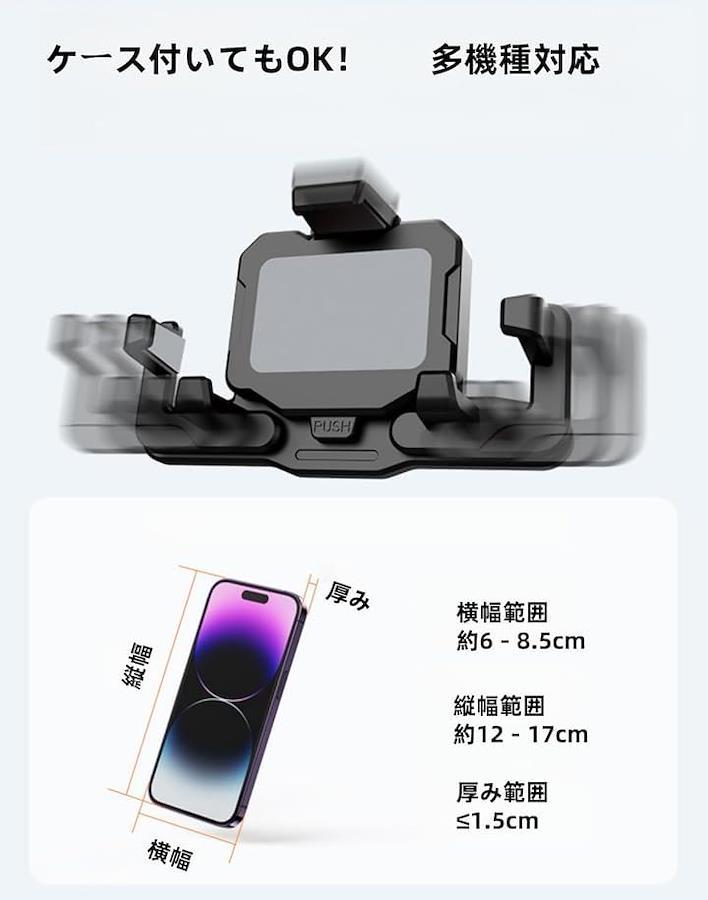 4.7インチから7インチのスマートフォンに最適で、ケース付きでも厚さ1.5cm以下ならしっかり固定。
