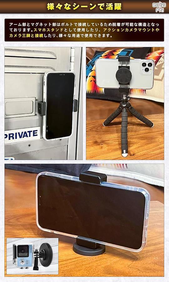 「様々シーンで活躍」スマホホルダーとしてだけではなく、スマホスタンドとして使用したり、アクションカメラやカメラ三脚と接続したり、様々な用途で使用できます!!*本製品はマウント部(スマホマウント)とマグネット部(ネジ付きマグネット)の2つのパーツのセット販売です。