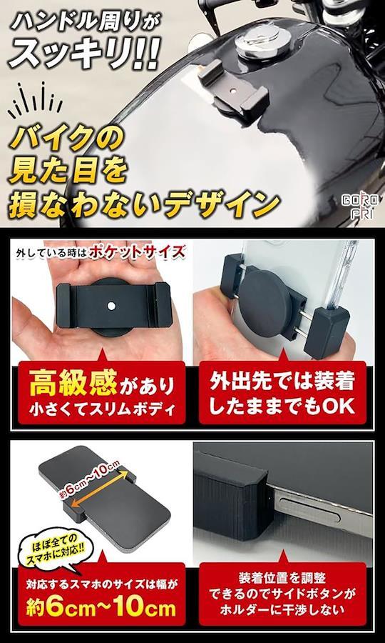 「超簡単な着脱方法」ワンタッチ!!面倒な取付不要!!スマホを挟んで燃料タンクに置くだけ!!スチール(鉄)製のタンクで、マグネットの貼付け面がフラットであればメーカーや車種は問いません!!またタンクを傷つけないように、マグネットはラバーコーティングされており傷つけにくい仕様となっております