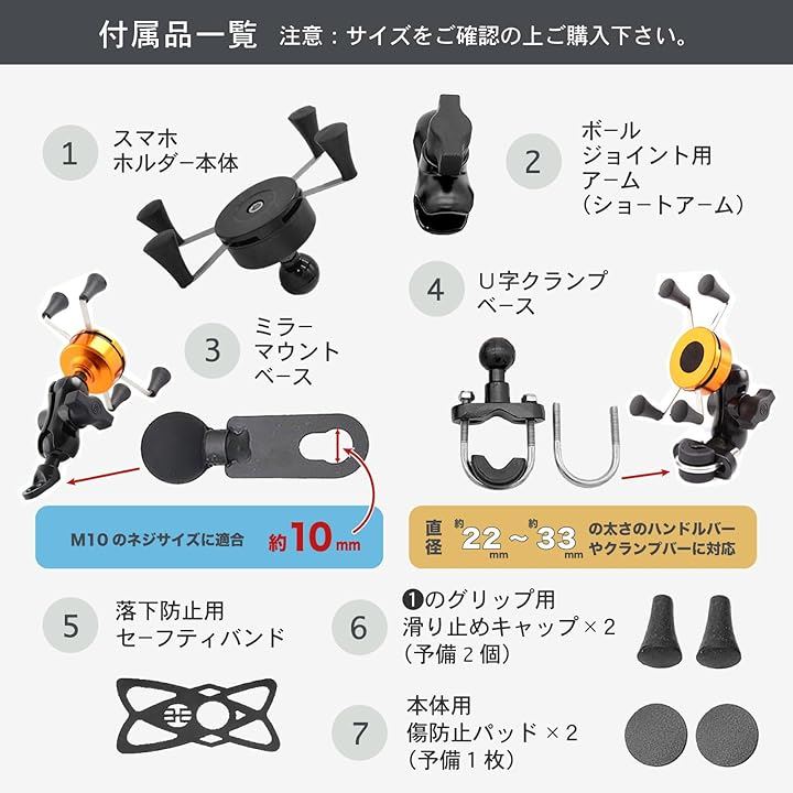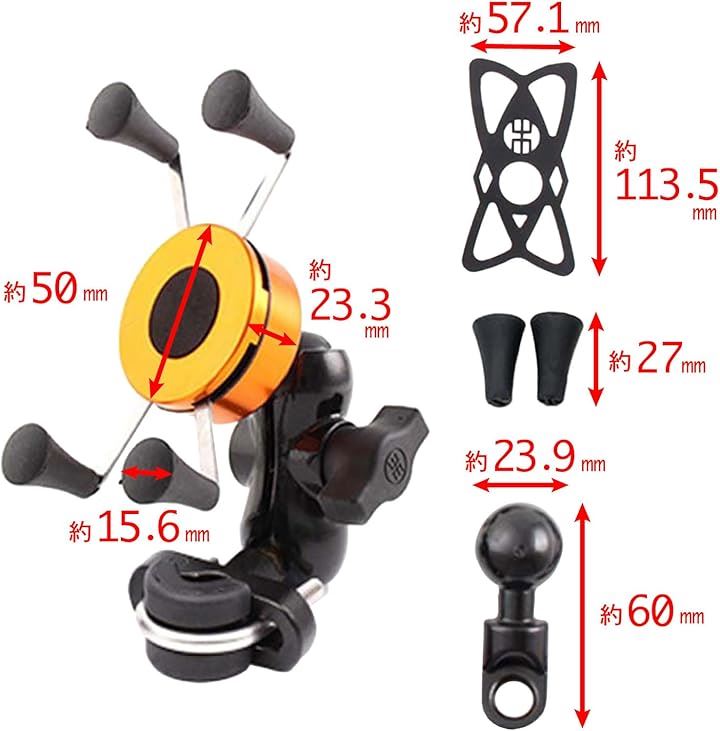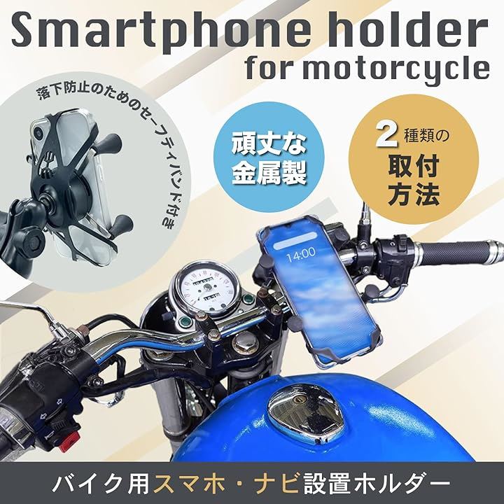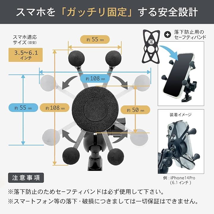 ガッチリ固定・金属製フレーム: バイク用スマホホルダーとして、アルミニウム合金製の金属フレームを採用し、しっかりとスマートフォンを固定。