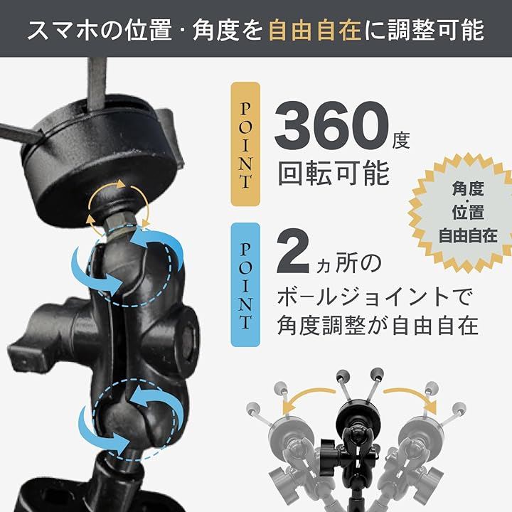 360度自由自在な位置調整: バイクスマホホルダーは2つのジョイントで、スマートフォンの位置や角度を360度自由に調整可能。