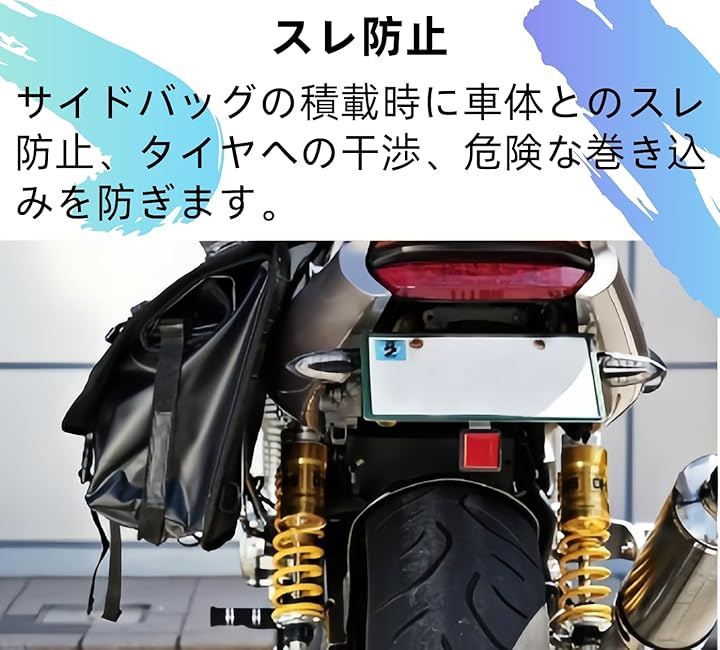 「スレ防止」サイドバッグの積載時に車体との擦れを防ぎ、タイヤへの干渉や危険な巻き込みを防止します。