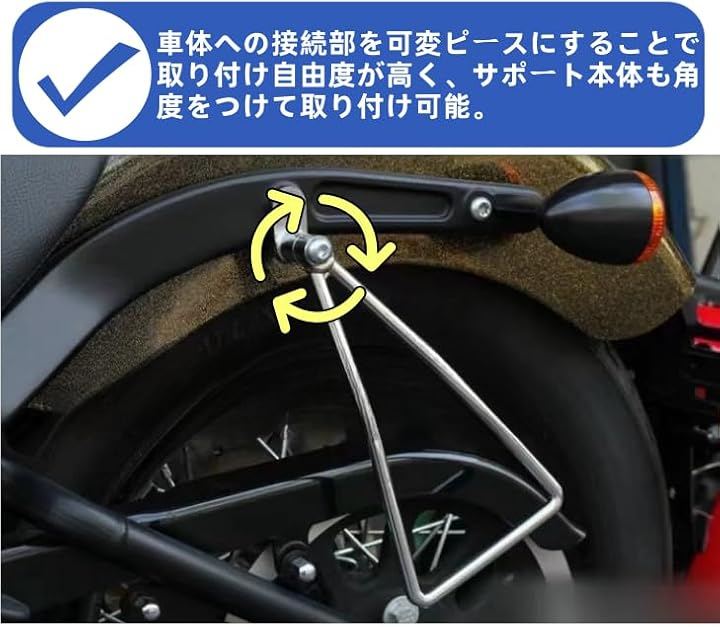 「取付角度調整可能」車体への接続部を可変ピースにすることで取り付け自由度が高く、サポート本体も角度をつけて取り付け可能です。