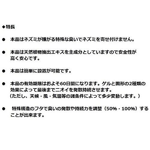 ● 本品はネズミが嫌がる特殊な臭いでネズミを寄せ付けません。 ● 本品は天然植物抽出エキスを主成分としていますので安全性が高く安心です。 ● 本品は簡単に設置が可能です。 ● 本品の有効期限はおよそ60日間になります。ゲルと固形の2種類の効果によって最後までニオイを発散持続させます。 ● 特殊構造のフタで臭いの発散や持続力を調整(50%・100%)することが出来ます。