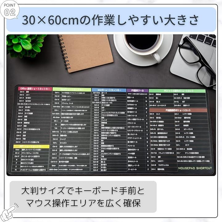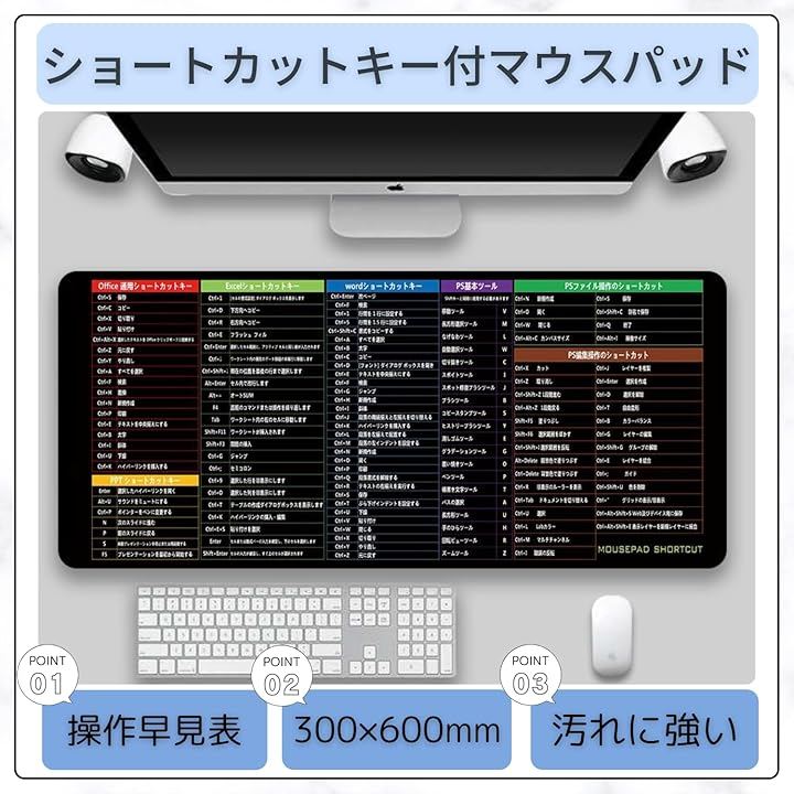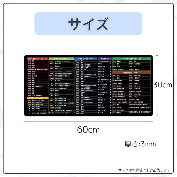 「商品仕様」サイズ:約300x600x3mm、素材:PVC表面、内容:Windowsショートカット(Office/Excel/Word/Photoshop)一覧印刷、用途:デスクマット・マウスパッド(*本製品は過剰な包装を避け、環境への負担を抑えるミニマルパッケージでお届けします。
