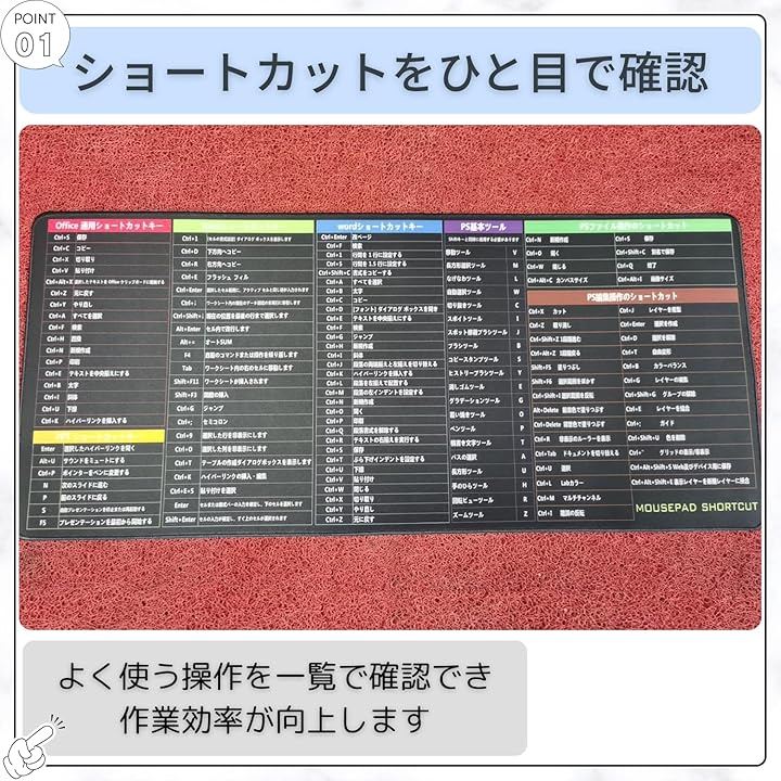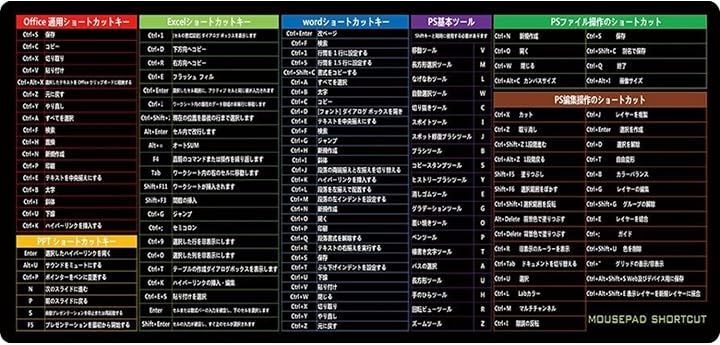 「実務で使うショートカットをひと目で確認」Windowsでよく使う保存・コピー・切り取りなどの基本操作から、Office、Excel、Word、Photoshopといった実務ソフトのショートカットまで一覧で確認できるマウスパッドです。