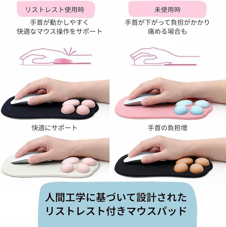人間工学に基づいた肉球型デザインが手首の自然な角度をサポートし、マウス操作時の負担を軽減します。