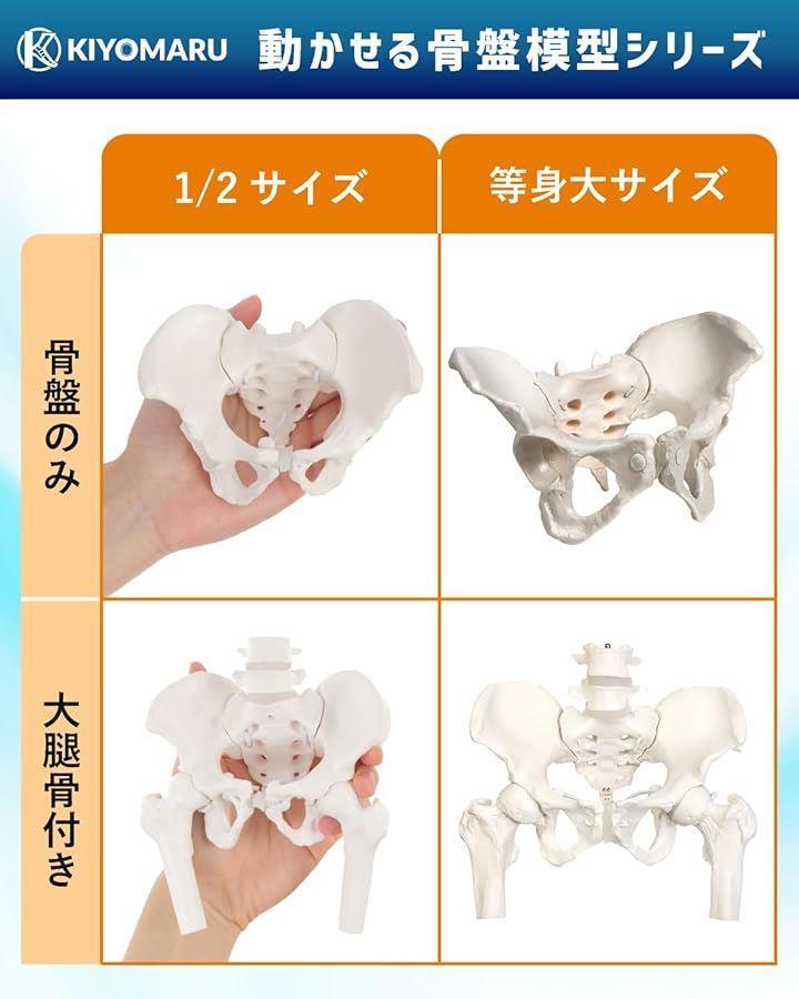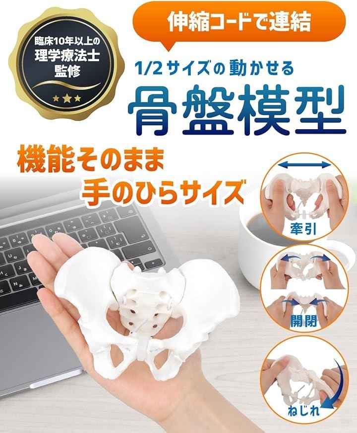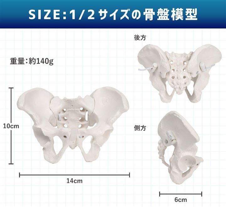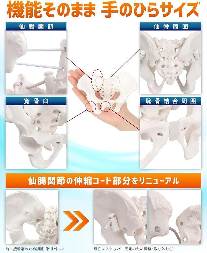 ミニサイズの骨盤でも仙腸関節と恥骨結合は伸縮コード連結されており可動できる骨格標本となっています。