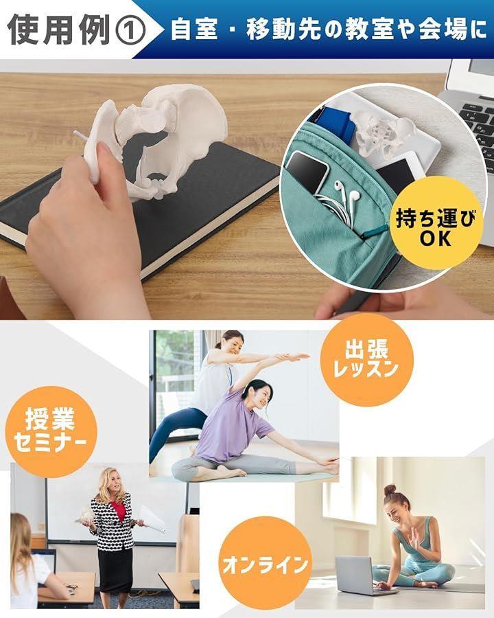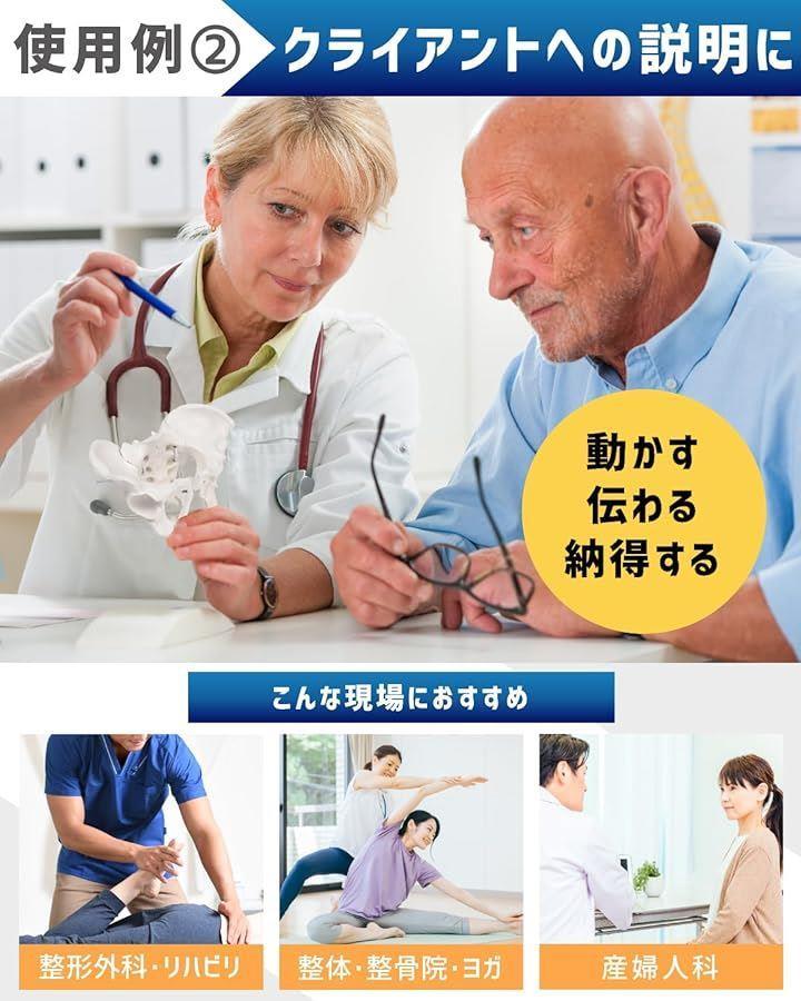 学生をはじめ、医師、看護師、助産師、リハビリ職種や整骨院、整体、各種セラピスト、ヨガ、骨盤矯正、インストラクターなど幅広く使用できる骨格模型。