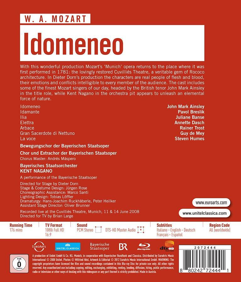 初演地、ミュンヘンのクリヴィエ劇場でのライヴ! 音楽監督ケント・ナガノの棒が冴える「イドメネオ」! モーツァルトのオペラセリアの傑作「イドメネオ」に素晴らしい映像が加わりました。2008年6月にミュンヘンで上演されたもの。劇場は、通常のナティオナル・テアターではなく、クヴィリエ劇場。1753年開場のこの由緒ある劇場は、1781年に「イドメネオ」を初演した旧宮廷歌劇場でもあります。定員500人ほどといいますから、非常に贅沢な上演。この「イドメネオ」は、改修作業が終わって再開場するに当たっての記念公演です。指揮はバイエルン国立歌劇場の音楽監督、ナガノ。モダンのオーケストラでもここまで新鮮なモーツァルトが可能なんだ、と驚かされるほど瑞々しい音楽を生み出しています。 タイトルロールは、英国が誇るモーツァルト・テノールの雄、エインズリー、存在感のある歌と演技で圧倒的。イリアは、吉田秀和氏も絶賛している美声&知性のソプラノ、バンゼ。またエレットラ役は、通常メッゾソプラノやベテランのソプラノが受け持つことが多い中で、あえて若く勢いのあるソプラノのダッシュを起用。このツイン・ソプラノがこの上演ではたいへんに上手く行っています。イダマンテは、チェコ出身のテノール、ブレスリク。今日一般的な男装メッゾにしなかったのは演出的理由と思われます。メキメキと頭角を現しているブリスク、素朴な容姿と優れた歌唱能力もあって、イダマンテは打ってつけです。 初演劇場での上演ですが、そこはミュンヘン、舞台は復古調ではありません。ドルンの演出は、トロイア戦争と近代の市民革命を重ね合わせたような舞台作りで、「イドメネオ」に生々しいドラマを与えることに成功しています。 [コメント提供;キングインターナショナル]