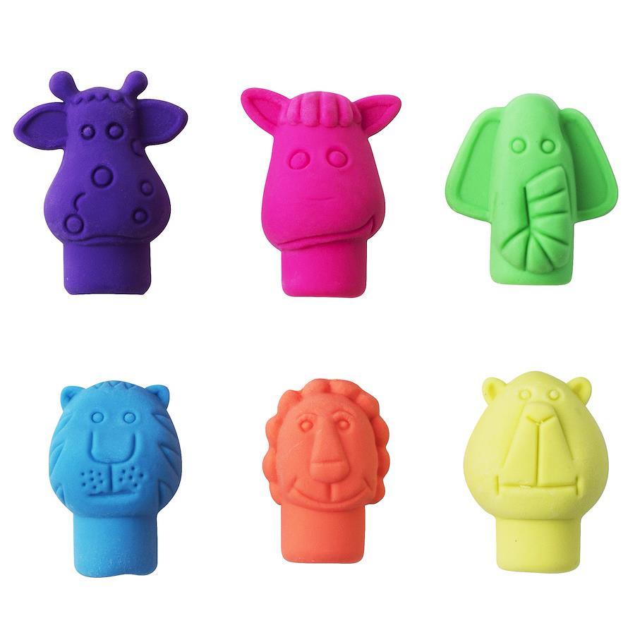 6つの異なるデザインと色の動物消しゴム60個入り。