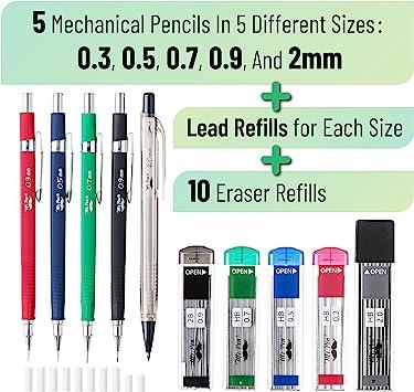 パッケージ内容: 5種類の異なるサイズのシャープペンシル5本。0.3、0.5、0.7、0.9、2mm (2mm芯用内蔵芯削り器付き)、各サイズ用芯替え芯、消しゴムトップリフィル。
