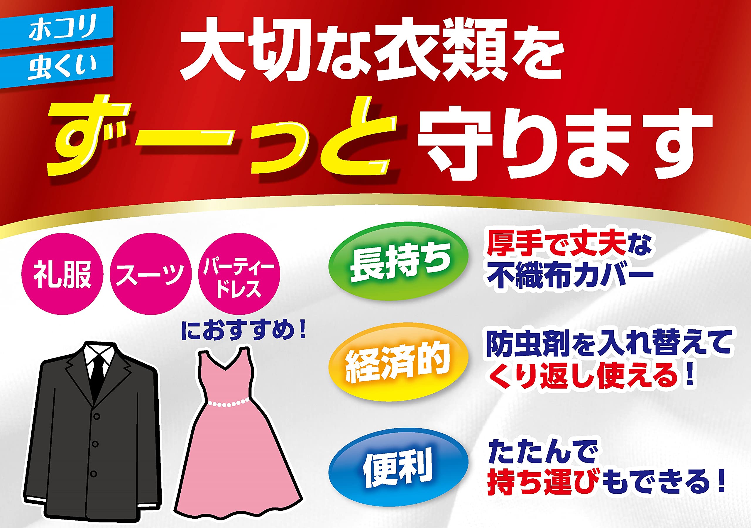 〇商品説明スーツ・コート・ワンピースが1~2着入り、折りたたんで持ち運びもできる衣類収納用カバーと無香タイプの防虫剤のセットです。4つの機能※で衣類を守ります。カバー内のダニよけ効果付き。防虫剤を取り替えてくり返し使えます。※防虫・消臭・防カビ・黄ばみ防止
