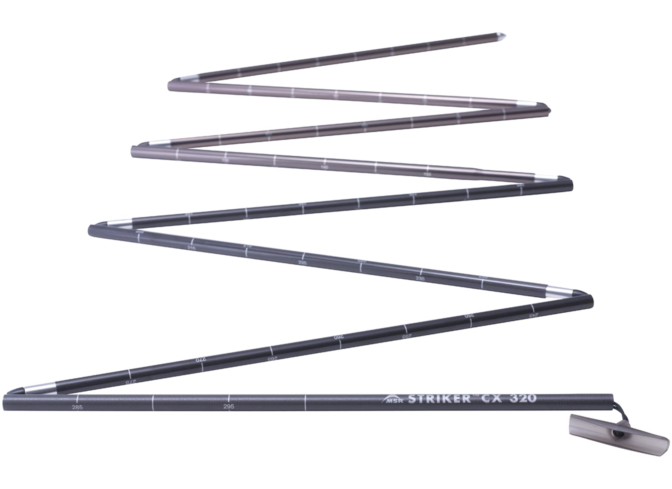 上段4本のチューブをカーボンファイバーにして軽量化したプローブです。下段の4本は軽量で高い強度を持つ7000シリーズのジュラルミン。8本のチューブを、耐蝕コーティングを施したステンレススチールケーブルで繋いでいます。精確なプロービングができるように、各チューブは緻密にデザインしました。先端側は直径を13mmに、チューブの壁も厚くして硬さを持たせ、雪に突き刺す際のたわみを軽減しています。一方の持ち手側は径を11mmと細くして軽量化し、手元の操作性を高めました。チューブ先端はテーパー状にして素早い組み立てを可能にし、握りやすいT型ハンドルを備えています。チューブには5cm刻みの目盛りを付け、雪の深さが一目で確認できます。