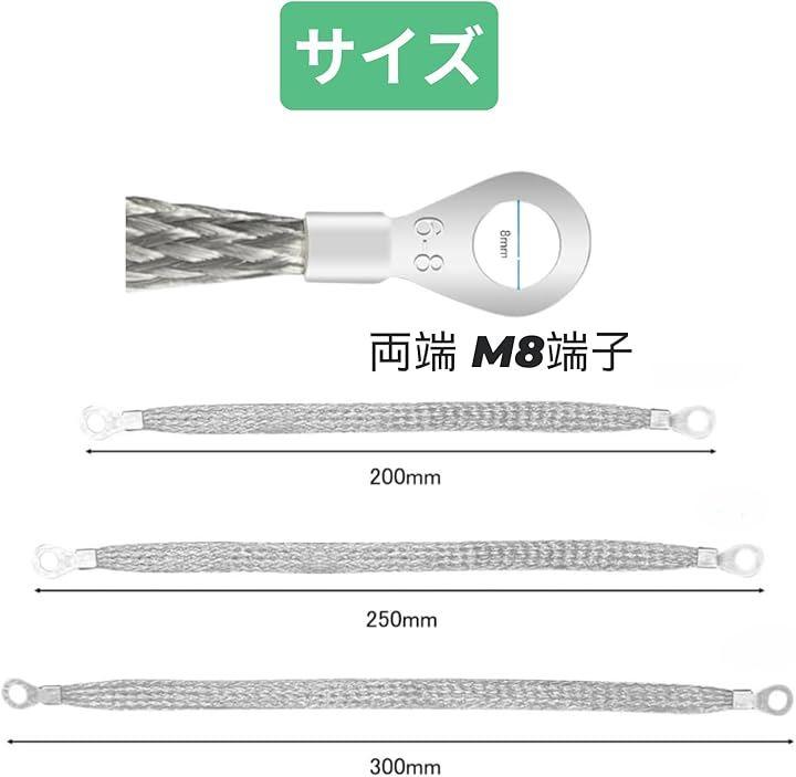 静電気除去 排気効率向上 トルク・レスポンスアップに 「商品仕様」 *セット内容:マフラーアース *サイズ:200mm、250mm、300mm *リング端子内径:両端8mm(M8) *素材:錫メッキ銅 *平編み6sq *マフラーバンド *サイズ:27mm-51mm *素材:ステンレス