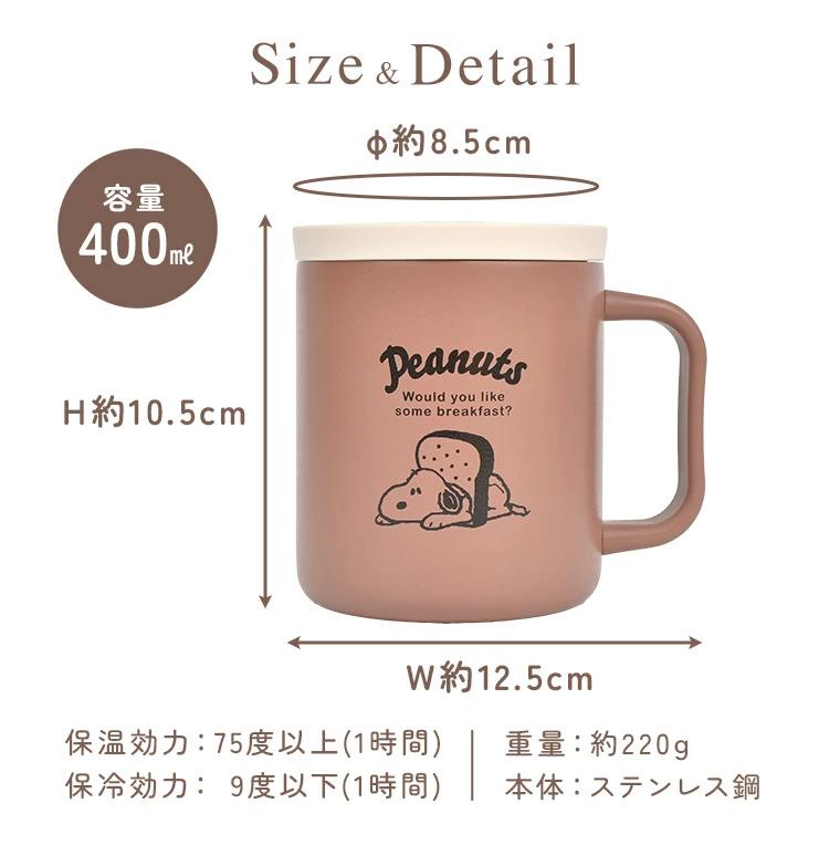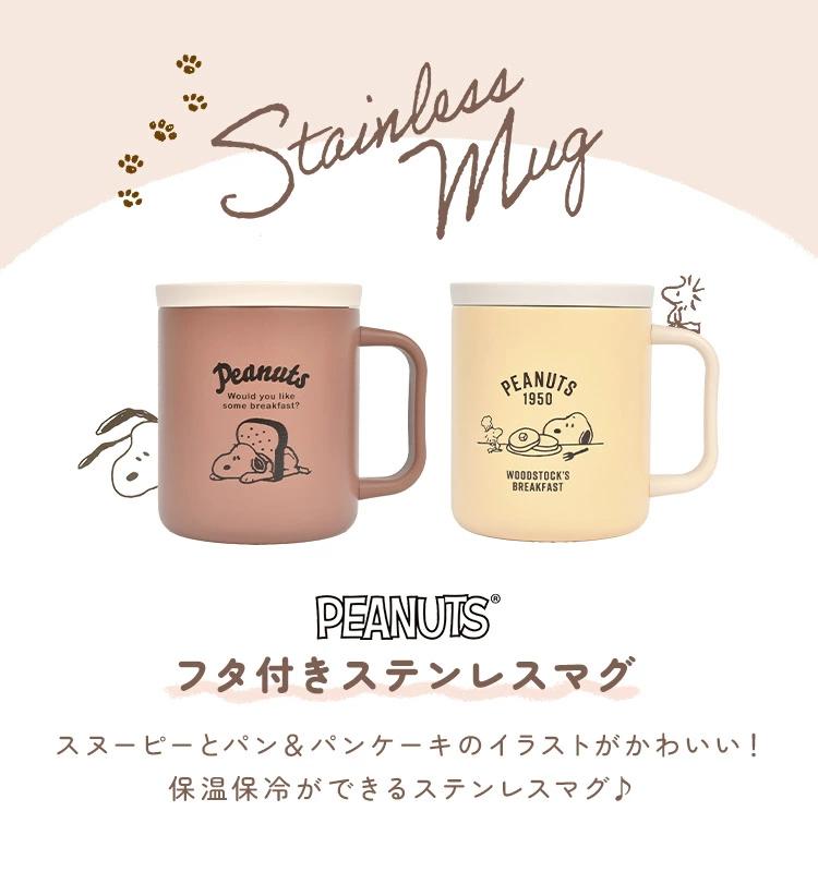 【ステンレスマグ】スヌーピーのイラストが可愛いステンレスマグは、毎日のティータイムを特別なものに変えます。重量220gと軽量でありながら、400mlの大容量を誇るため、たっぷりと飲み物を楽しめます。ほっこり可愛いカラーが心を和ませ、真空二重構造により保温・保冷効果も抜群です。フタ付きで持ち運びにも便利なこのマグは、オフィスや自宅での使用にぴったりです。
