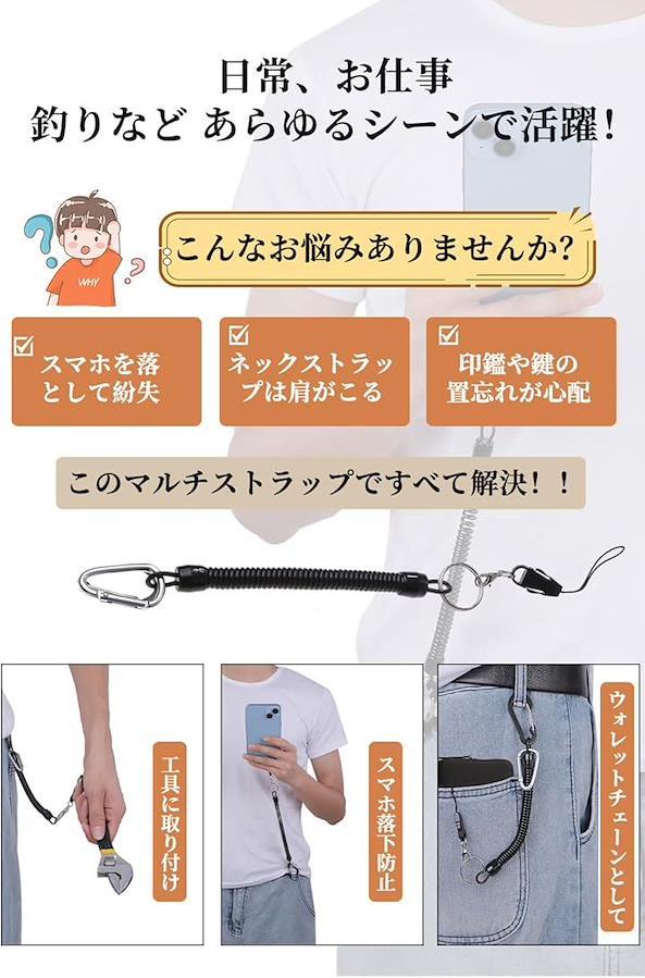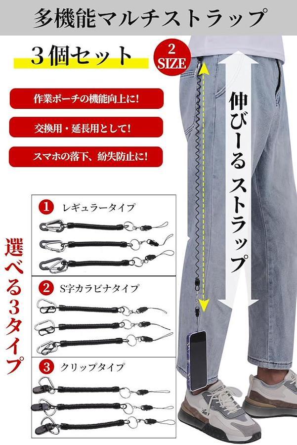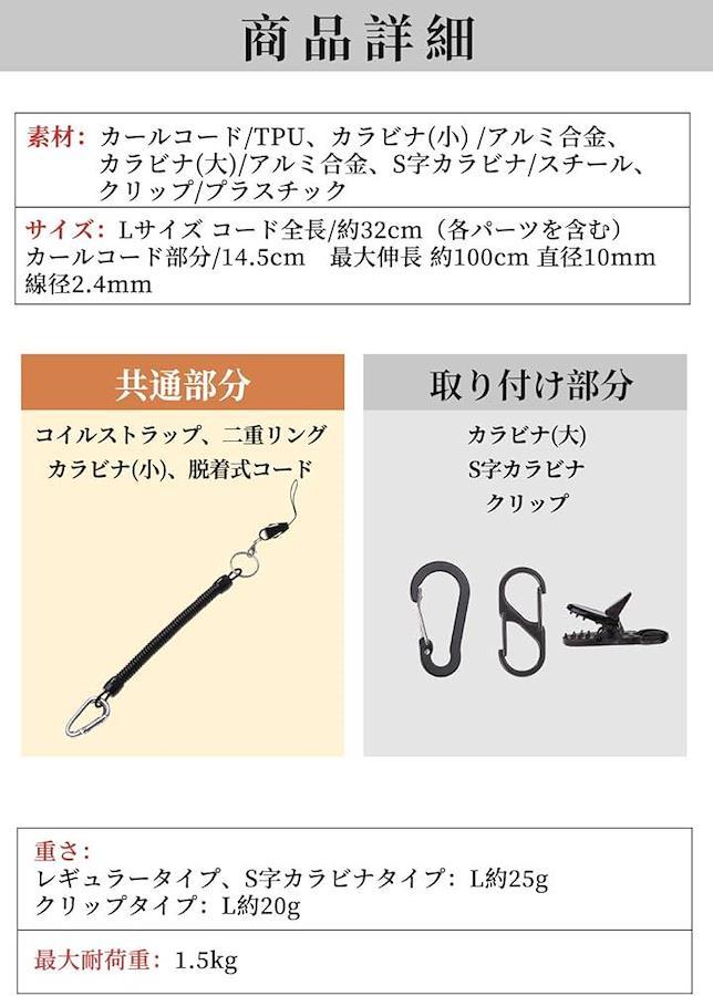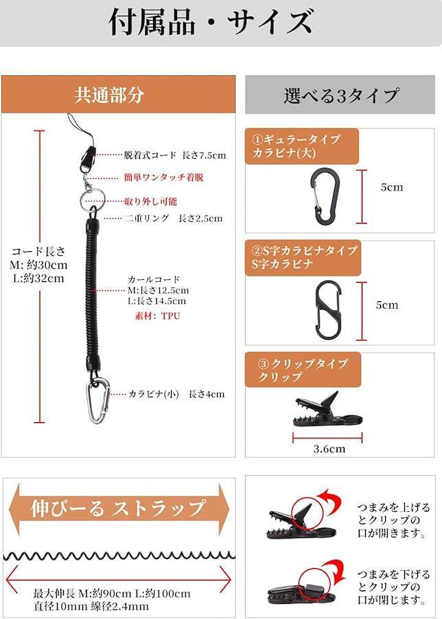 *「商品詳細」商品内容 共通部分:コイルストラップ、二重リング、カラビナ(小)、脱着式コード 取り付け部分:レギュラータイプ:カラビナ(大) 、S字カラビナタイプ:S字カラビナ、クリップタイプ:クリップ 素材:カールコード/TPU、カラビナ(小) /アルミ合金、カラビナ(大)/アルミ合金、S字カラビナ/スチール、クリップ/プラスチック サイズ(コード全長):Mサイズ/約30cm Lサイズ/約32cm 重さ:レギュラータイプ、S字カラビナタイプ M 約20g L約25g、クリップタイプ M 約15g L約20g 最大耐荷重:1.5kg