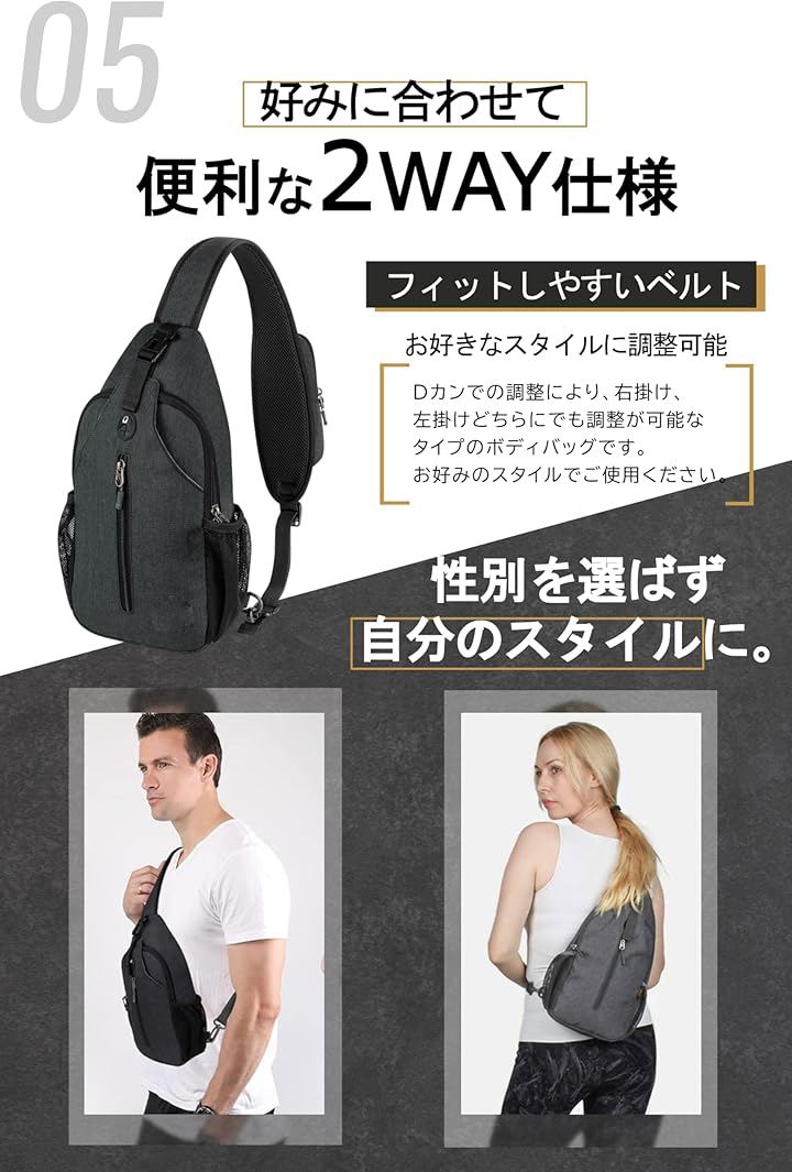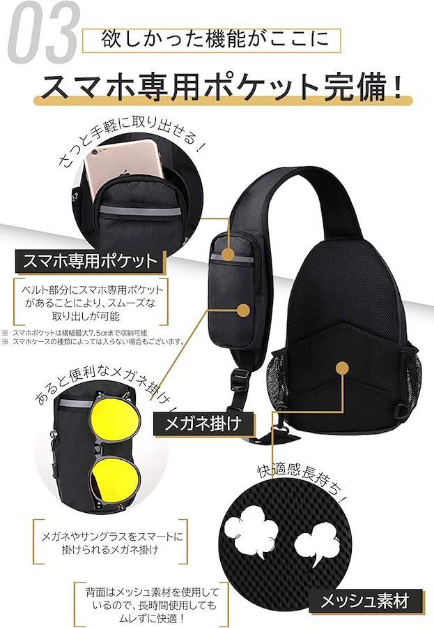 「スマートフォンが取り出しやすい」このボディバッグには多数の収納ポケットがあり、収納力抜群です。