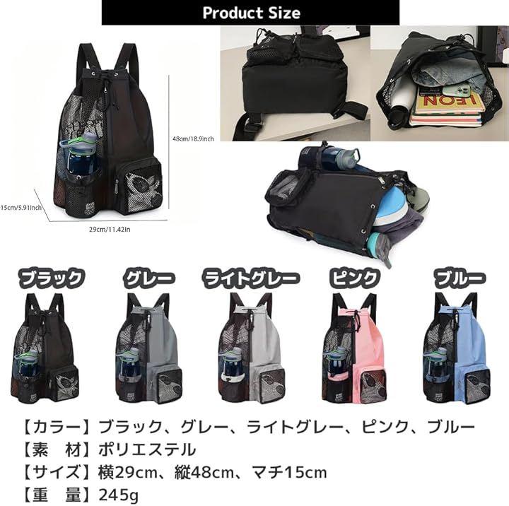 メッシュ素材で通気性に優れおり、濡れたタオルや運動後の着替えを持ち運ぶのにもぴったりです。