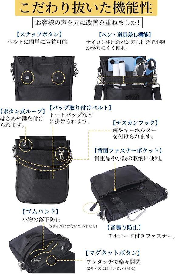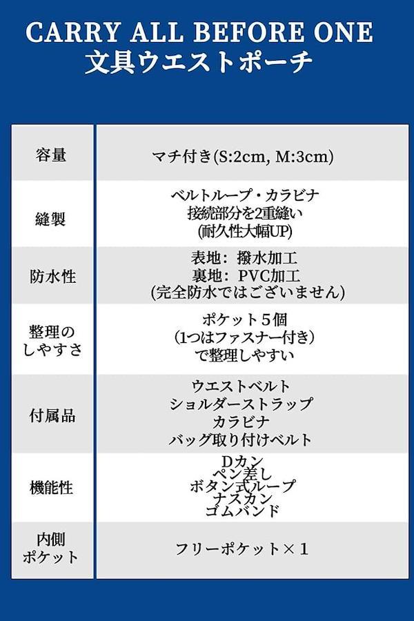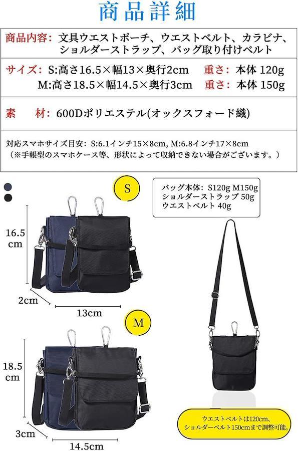 *「商品詳細」商品内容:文具ウエストポーチ、ウエストベルト、ショルダーストラップ、カラビナ、バッグ取り付けベルト サイズ S:高さ16.5x幅13x奥行2cm, M:高さ18.5x幅14.5x奥行3cm 重量 本体 S:120g, M:150g ショルダーストラップ 50g ウエストベルト 40g 素材:600Dポリエステル(オックスフォード織) ウエストベルトは120cm、ショルダーベルトは150cmまで調整可能。