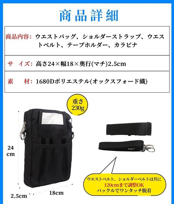 v「商品仕様」 商品内容:ウエストバッグ、ショルダーストラップ、ウエストベルト、テープホルダー、カラビナ サイズ:高さ24x幅18x奥行(マチ)2.5cm 重量:230g 素材:1680Dポリエステル(オックスフォード織)