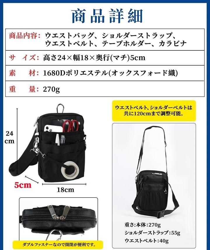 「商品仕様」 商品内容:ウエストバッグ、ショルダーストラップ、ウエストベルト、テープホルダー、カラビナ サイズ:高さ24x幅18x奥行5cm(メインポケット2.5cm+フロントポケット2.5cm) 重量:270g 素材:1680Dポリエステル(オックスフォード織)