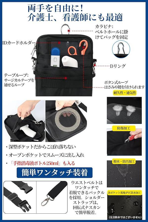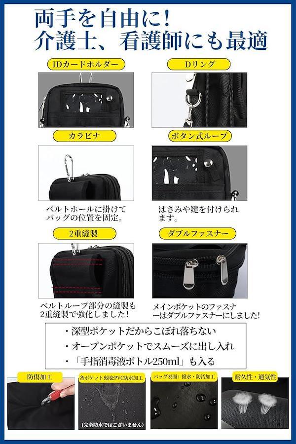 「12個の大小複数ポケット」メモ帳、スマホ、A6・B6ノートなどが入る大きめポケット、貴重品収納に便利な内部ファスナーポケット、ペンやハサミ等が入る細長ポケット、小物収納にぴったりのフロントポケットなど、大小ポケットの組み合わせで使いやすさ抜群。「消毒液ボトル250ml」も入るので、ナースオーガナイザーとしても便利です。