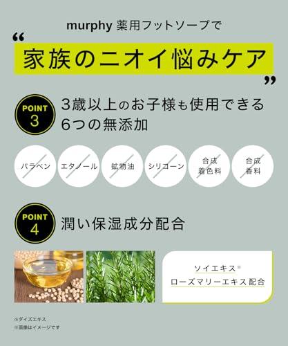 ??【薬用】殺菌有効成分※1がニオイの原因菌※2を殺菌消毒!におわない足へ導くフットソープ(※1:イソプロピルメチルフェノール?/※2:汗などの汚れ?) ??殺菌有効成分※1が「体臭」を予防し「加齢臭」もスッキリ! ワキ・首筋など足以外のボディパーツにも使用可能(※1:イソプロピルメチルフェノール?) ??3歳以上のお子様も毎日使用可能!ご家族のニオイ悩みをデイリーケアできるフットソープ ??潤い保湿成分【ソイエキス】【ローズマリーエキス】?配合で洗いながら保湿ケア ??使い心地に配慮した6つの無添加 (パラベン・エタノール・鉱物油・シリコーン・合成着色料・合成香料) ??「murphyフットブラシ(別売)」と合わせ使いで、しっかり足裏洗浄がオススメ!