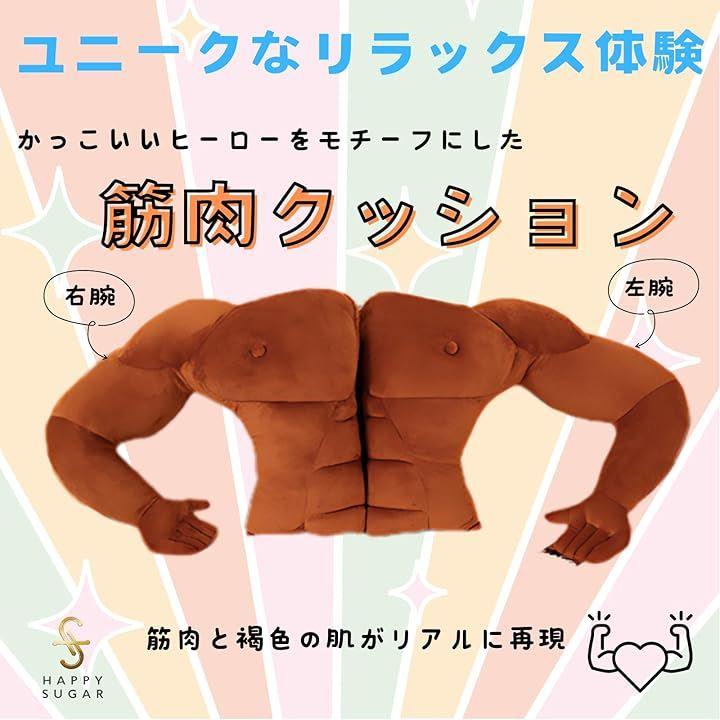 「リアルなデザインと高級感」ベルベットやベロア風の高級感ある素材を使用し、上腕二頭筋や胸筋がリアルに再現されています。