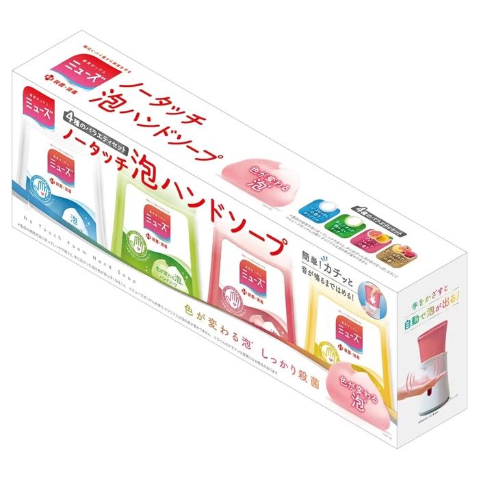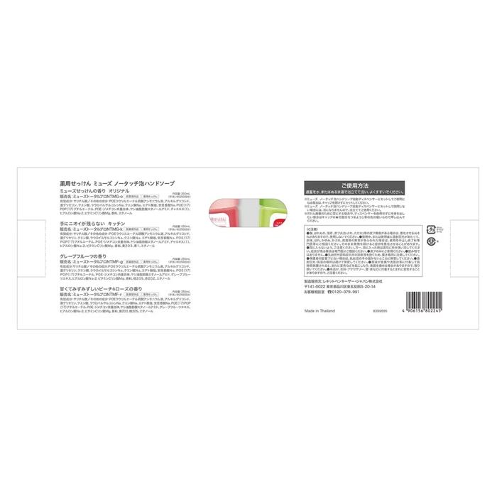 ・ミューズノータッチ本体につけかえてお使いいただく泡タイプのハンドソープ・香り:オリジナル/キッチン/グレープフルーツ/ピーチ&ローズの4種アソート・内容量:250mlx 4個 (約1000回分)・幅広いバイ菌をしっかり殺菌・消毒するとともに、保湿成分配合で手肌のカサつきを防ぎます・原産国:タイ