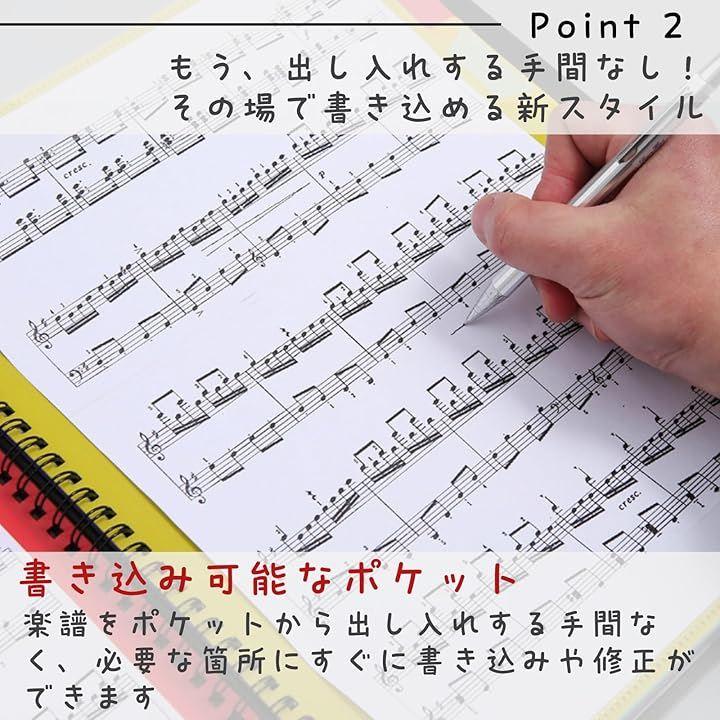 最大40枚のA4サイズの楽譜を収納でき、多くの楽曲を一冊にまとめて管理できます。