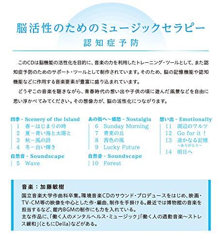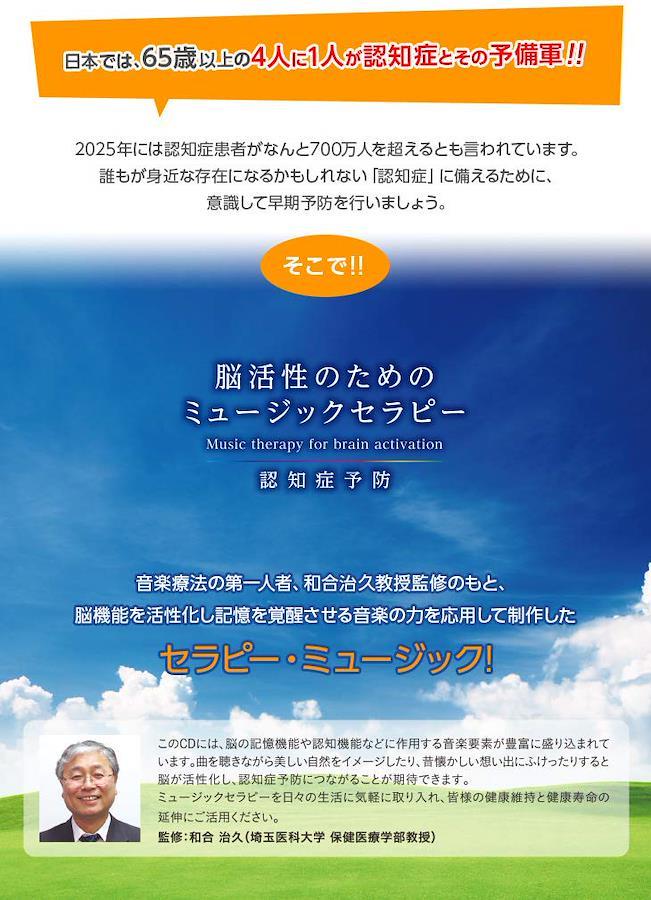 このCDは、音楽療法の第一人者、和合治久教授監修のもと、脳機能を活性化し記憶を覚醒させるのに有効な音楽の力を応用して制作された、オリジナルのセラピー・ミュージック。脳の記憶機能や認知機能などに作用する音楽要素が豊富に盛り込まれ、曲を聴きながら美しい四季をイメージしたり、青春時代の想い出に耽ったりすることがしやすくなります。
