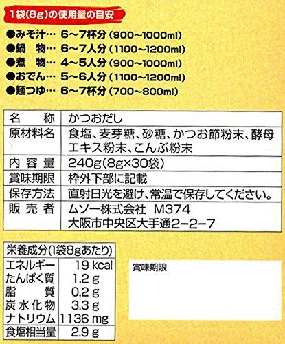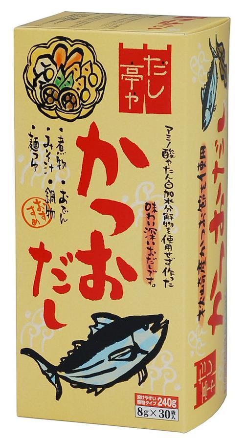枕崎産かつおぶしと北海道産昆布を使用した、溶けやすい顆粒タイプのだしの素です。30袋入りのお徳用です。アミノ酸やたんぱく加水分解物は使用しておりません。砂糖はてんさい糖を使用しています。1袋(8g)で味噌汁・鍋物・煮物・おでん・麺つゆ等色々な料理にお使いいただけます。