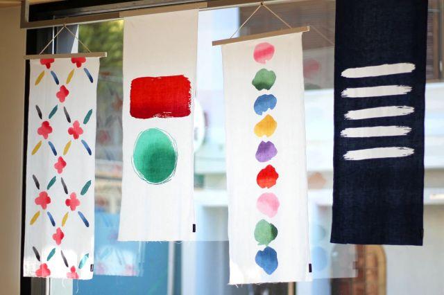 選ばれたデザインは、てぬぐいの老舗「かまわぬ」で、伝統的な「注染」で染め、裏表なく、鮮やかな色彩を再現しています。「SONO」「HANAMICHI」「ISHI」などの原画が持つ濃淡も滲ませて表現しました。