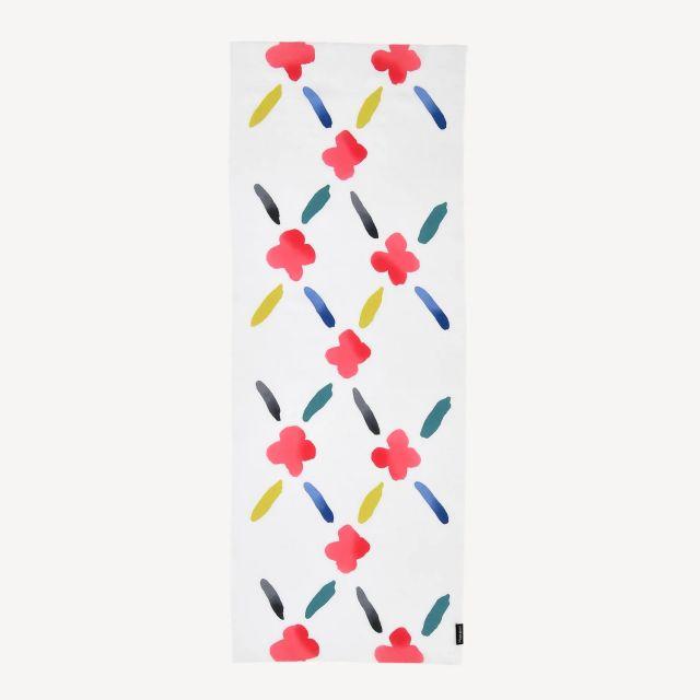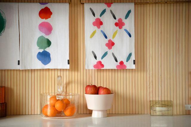 吸水性の高い生地のため、布巾として手や濡れたものを拭いたり、1枚あると便利です。使えば使うほど、肌触りが良く、手に馴染みます。また、インテリアとしてもお楽しみいただけます。吊るして掛け軸のように飾る、半分に折り畳んだ状態で現れる柄も楽しむなど、その鮮やかな色彩は空間コーディネートのポイントになります。石本藤雄の遊び心や彩りを、自由に取り入れてお楽しみください。