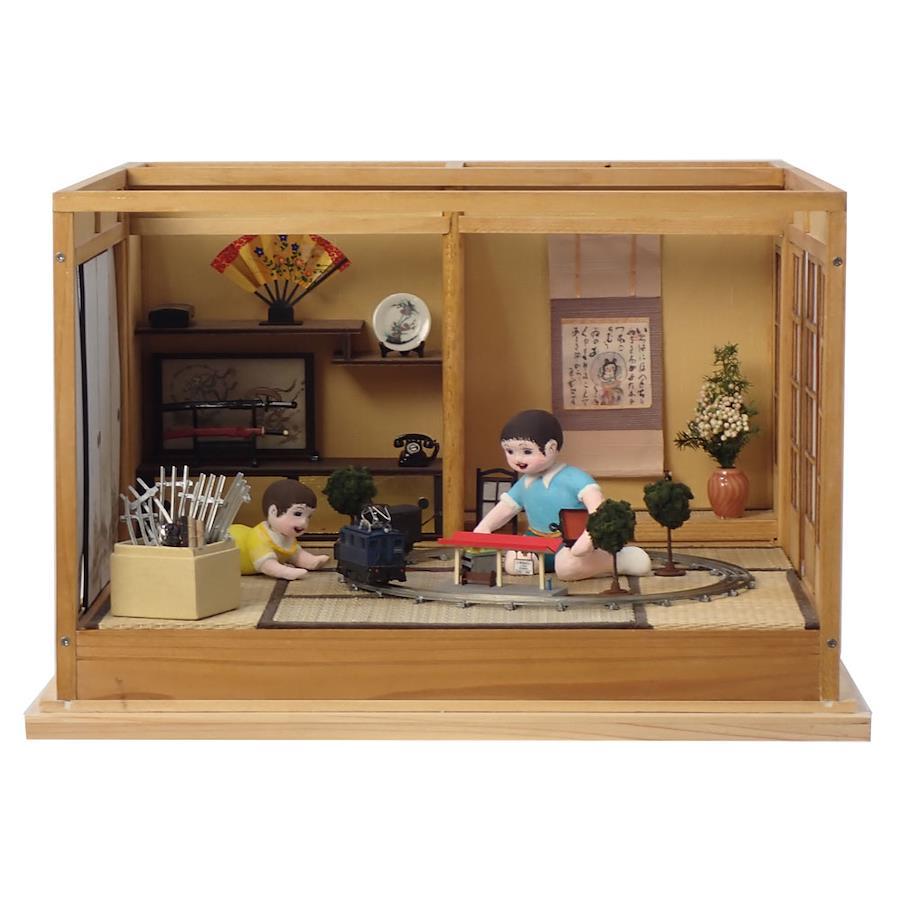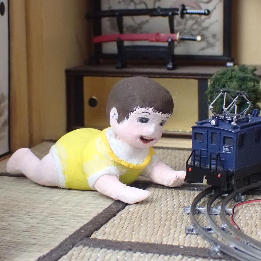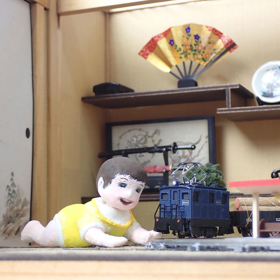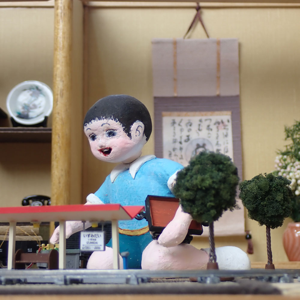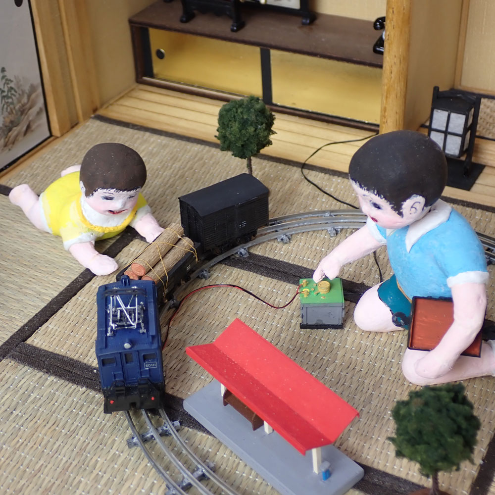 This work reproduces such memories of those days with priority given to the image. The cars running in the ultra-compact layout were specially made by Mr. Ishikawa, and the dolls were also made by him with a retro touch, as if they appeared on the cover of a children's book or picture book of the time.